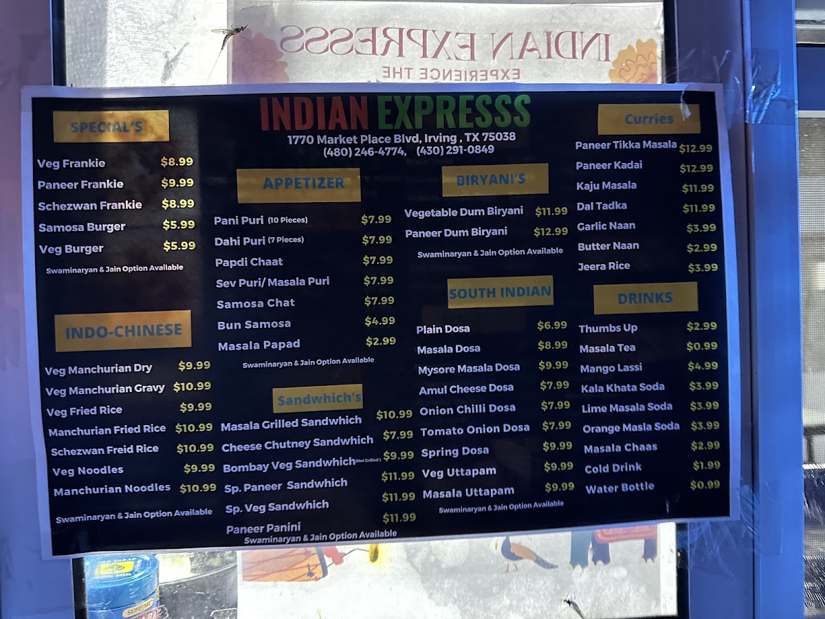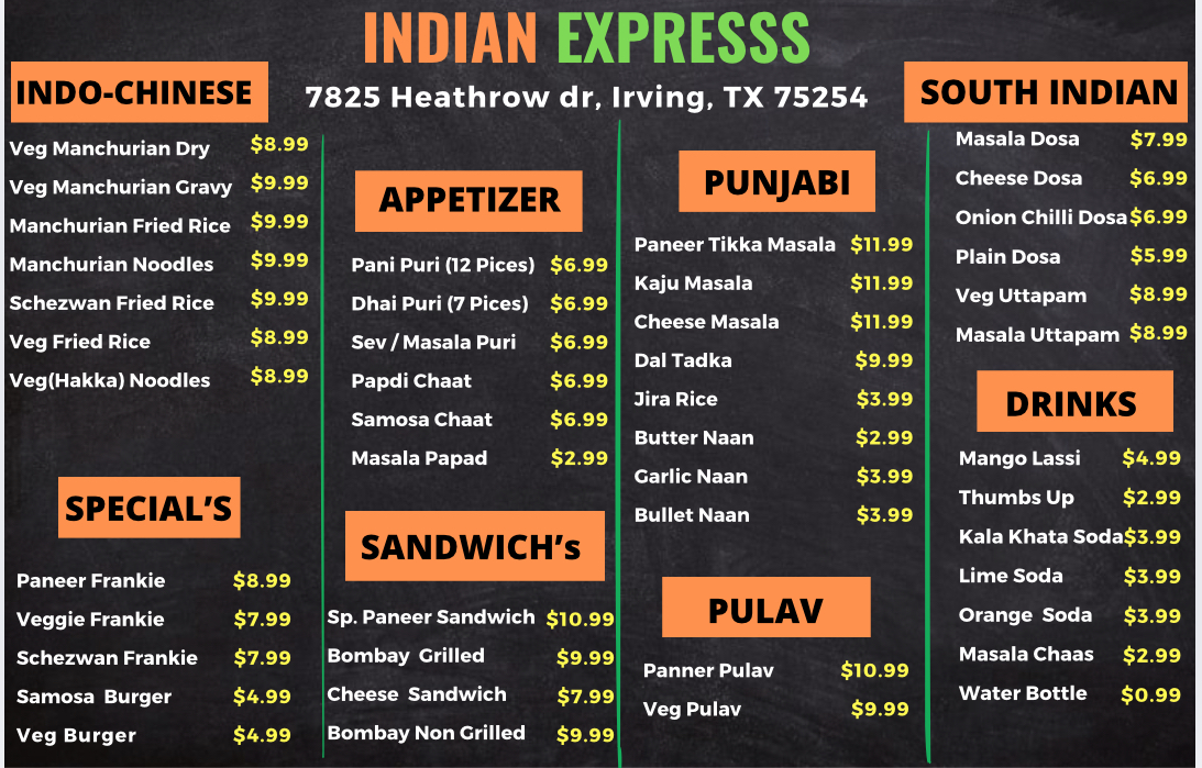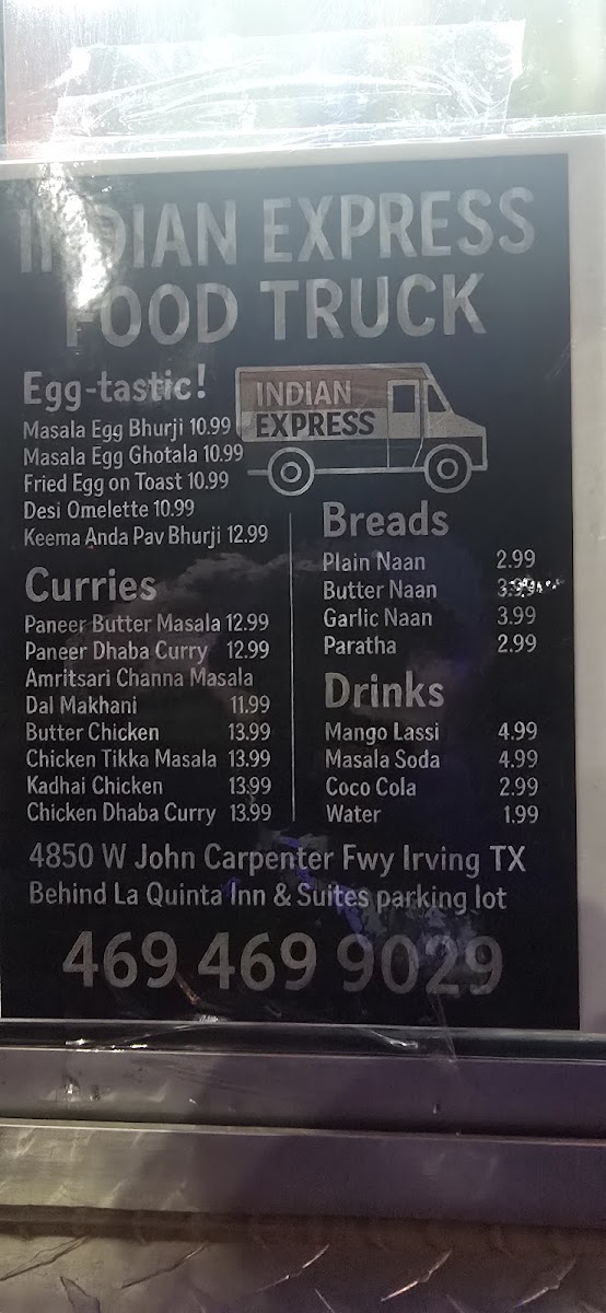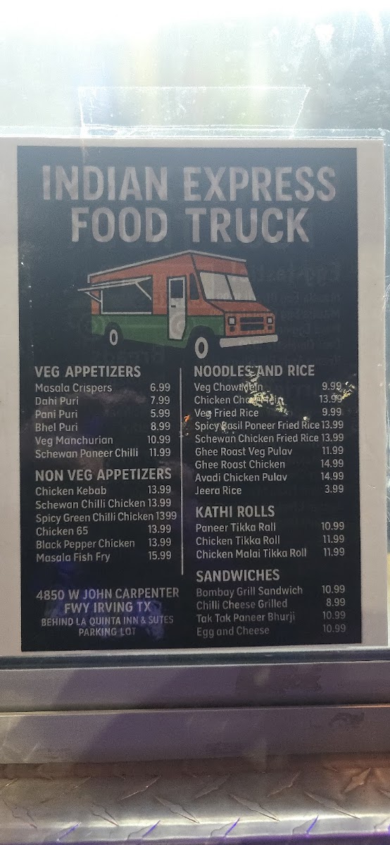 From a reviewer's perspective, the menu at Indian Expresss Food Truck at 4850 W John Carpenter Fwy, Irving, TX offers a satisfying blend of classic Indian and Indo-Chinese flavors, perfectly suited for both quick bites and hearty meals. The Indo-Chinese section includes favorites like Veg Fried Rice, Chicken Fried Rice, Egg Fried Rice, Veg Noodles, and Chicken Noodles, delivering flavorful, comforting options for every palate. For starters, the Veg Appetizers such as Onion Pakoda, Mirchi Bajji (4-Pic), Samosa (3-Pic), Gobi 65, and Paneer 65 bring a variety of textures and spices, while the NonVeg Appetizers like Chicken 65, Chilli Chicken, Chicken Pakoda, Casu Chicken Pakoda, and Chicken Lollipop satisfy cravings for savory, spiced meats. Moving to the Main Course, dishes like Paneer Butter Masala, Paneer Tikka Masala, Butter Chicken, and Chicken Tikka showcase the richness and depth of Indian curries. Complementing these are the soft, fresh Breads including Butter Naan, Plain Naan, Garlic Naan, Roti, and Paratha, ideal for scooping up the flavorful sauces. To round out the meal, the Drinks menu features refreshing choices like Mango Lassi, Water Bottle, Coke, Pepsi, and Sprite, providing a sweet or fizzy finish. Overall, the menu strikes a well-balanced mix of indulgent, spicy, and comforting dishes at approachable price points, making Indian Expresss Food Truck a convenient yet satisfying stop for anyone craving authentic Indian and Indo-Chinese flavors.